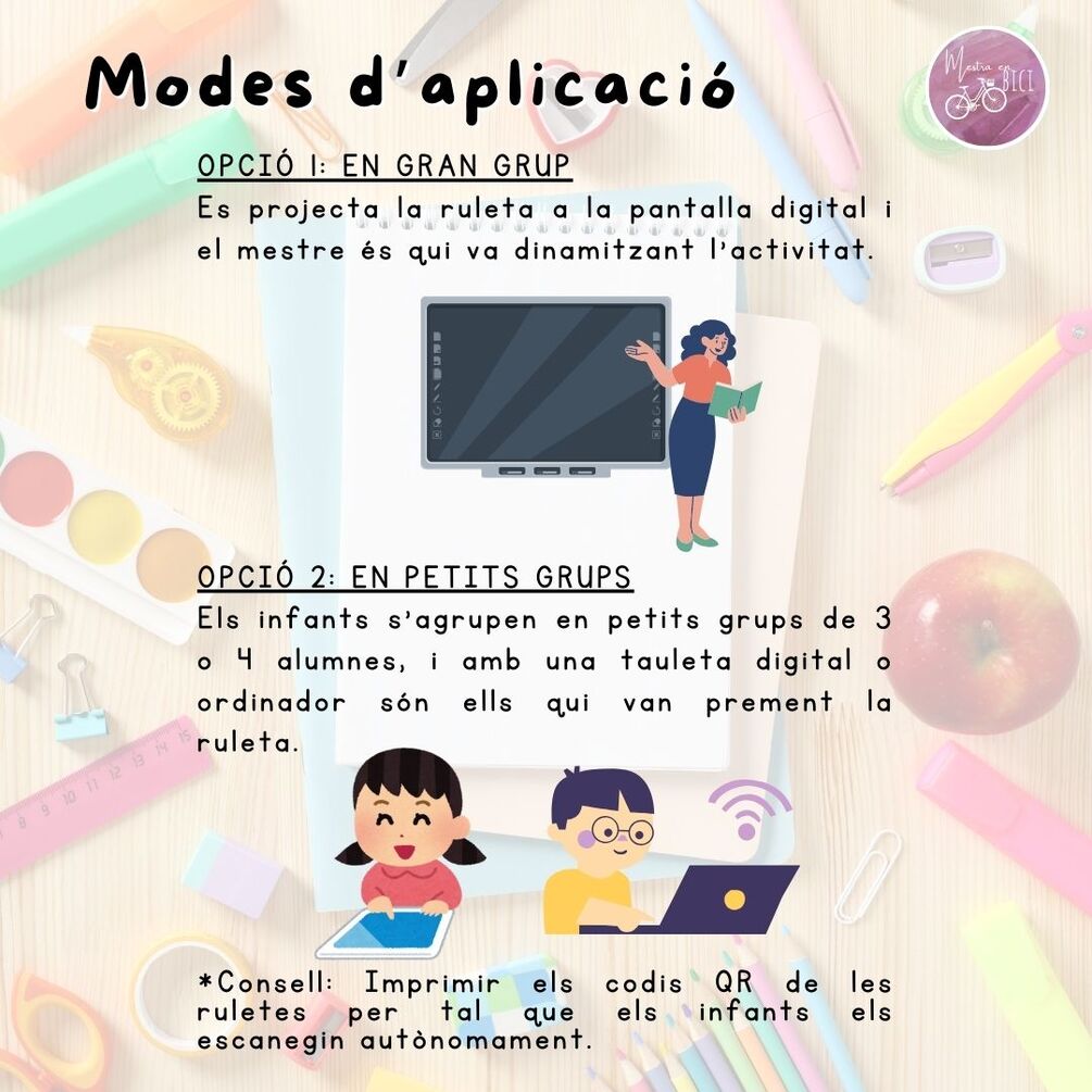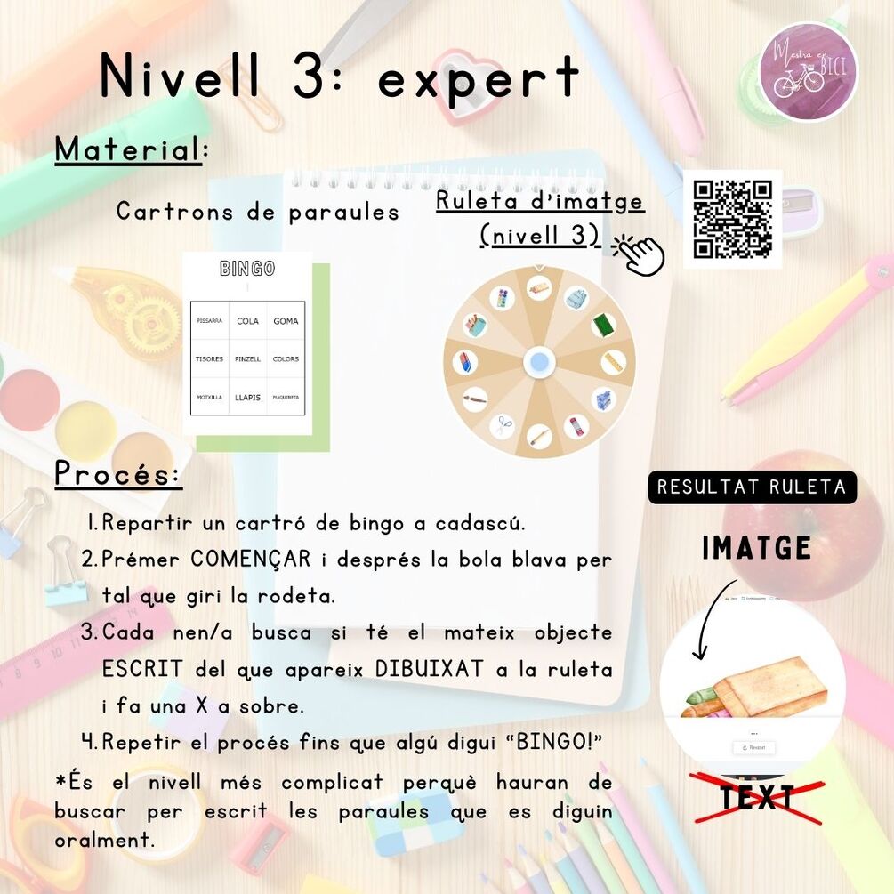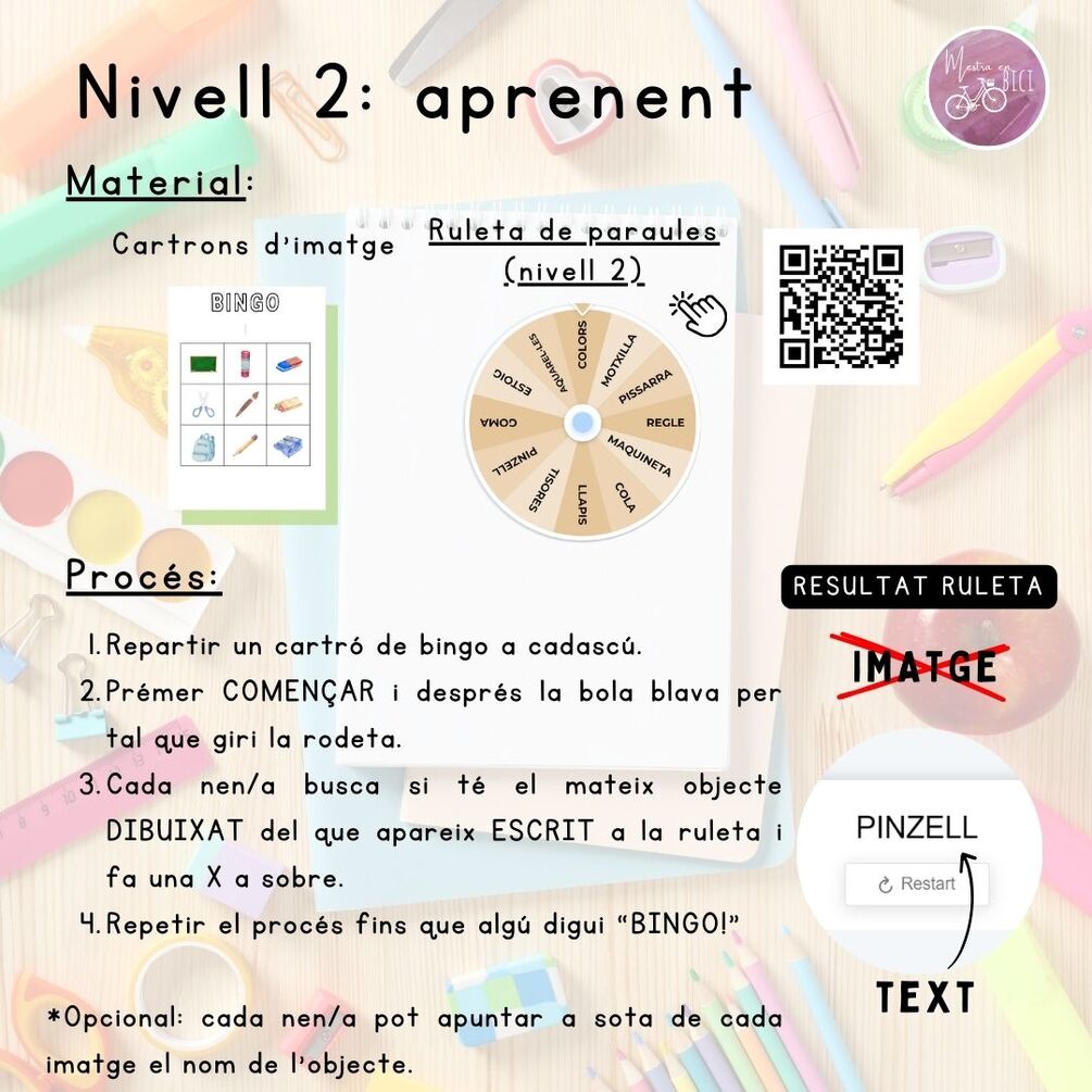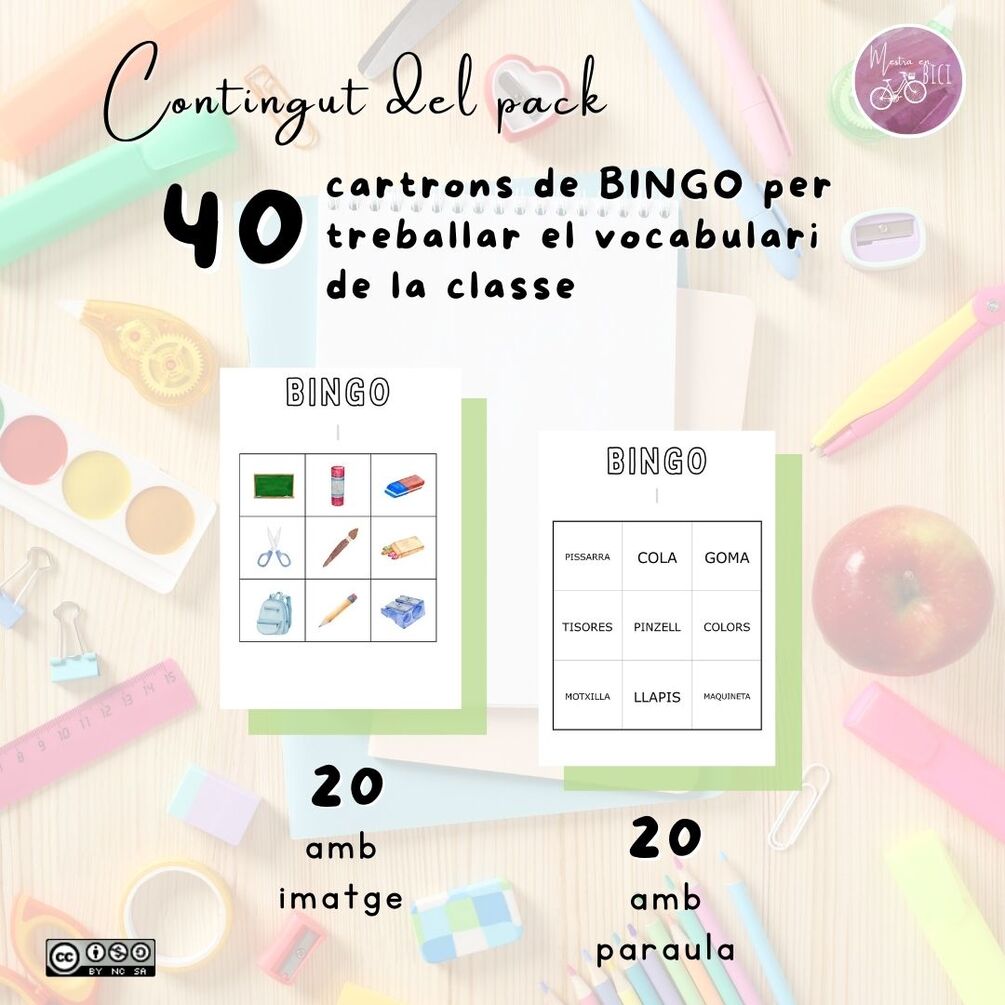 Consta de 40 cartrons (20 cartrons amb imatges i 20 cartrons amb paraules) i 3 ruletes online per tal de jugar al BINGO de forma interactiva. Si voleu que us expliqui com he fet aquestes ruletes, consulteu el meu instagram @mestraenbici.