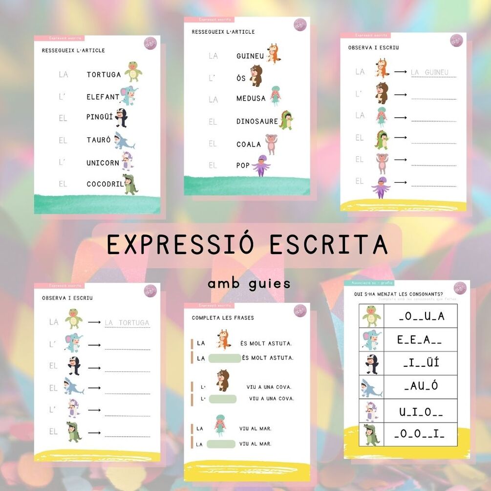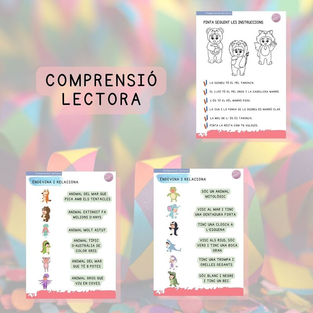Recull de 24 pàgines per treballar la lectoescriptura contextualitzada amb la festa de Carnestoltes, on es treballarà el vocabulari de disfresses temàtica animals. 🦈🐡🐻🦖🦄🐨🐘🐙🪼