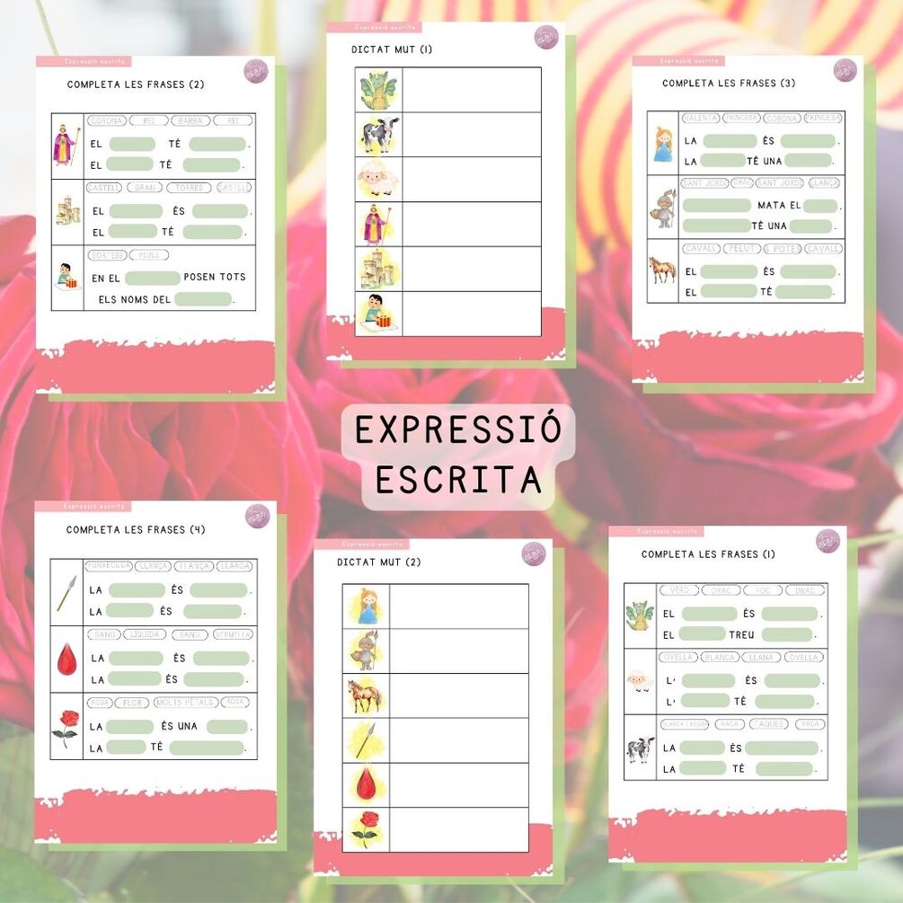 Diferents activitats per treballar la lectoescriptura amb vocabulari de la tradicional llegenda de Sant Jordi.